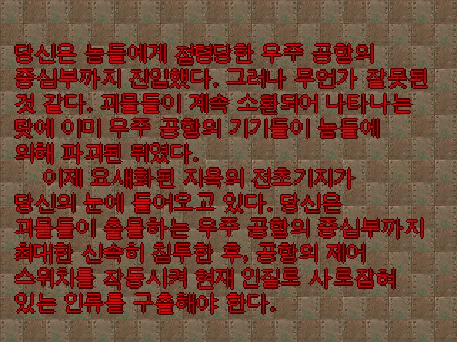 Korean is a versatile and useful language that is used by combining various characters. Sometimes when long, foreign sentences are translated into Korean, space can be conserved by shortening the length. Thanks to new innovations in GZDoom, which is now compatible with Unicode, incorporating Hangul characters into Doom has never been easier.